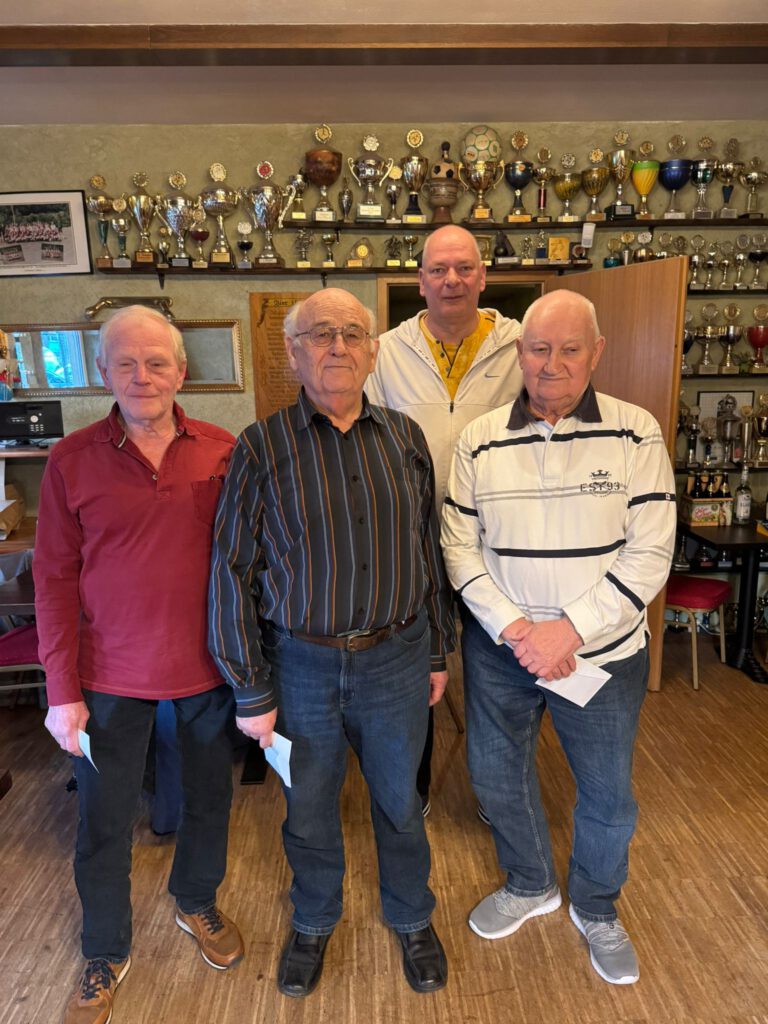 Das siebte Skatturnier der Achterserie des FSV Silvester 91 konnte Günter Hermann (2.v.r.) für sich entscheiden. Ihm reichten 1870 Punkte , um Harald Mente (l.) mit 1612 Punkten auf Platz zwei zu verweisen. Dritter wurde Dirk Siebert (2.v.r.) mit 1500 Spielpunkten. Rang vier ging an Helmut Scharfenberg (r.) mit 1466 Punkten. Das achte und letzte…