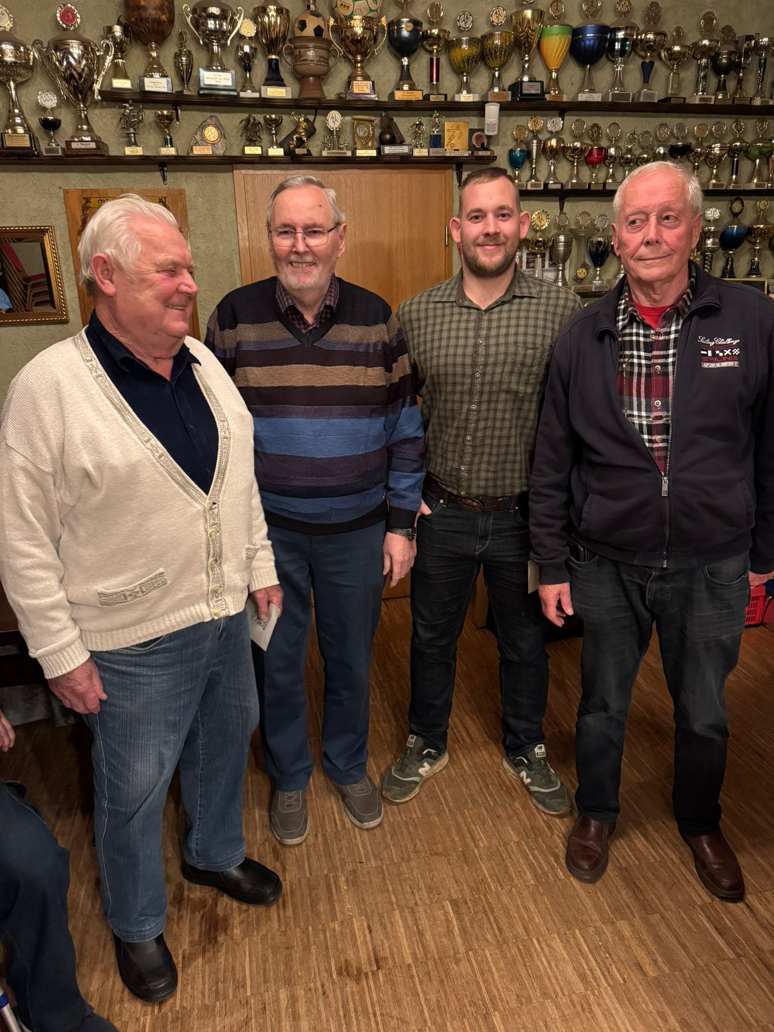 Manfred Drechsel (r.) gewann das 3. Skatturnier des FSV Silvester 91 an fünf Tischen mit 2214 Punkten. Platz zwei belegte mit 2177 Punkten Benjamin Kleinhans(2.v.r.) und er verwies Eckard Röth (2.v.l.) mit 2145 Spielpunkten auf Rang drei.  Platz vier ging an Manfred Friedrich (l.) der sich 2049 Punkte erspielte. Es folgten Steffen Krüger und Michael Illhardt. Das Weihnachtsturnier wird am 14.12.25 ab 13.30 Uhr im Green Horse gespielt.