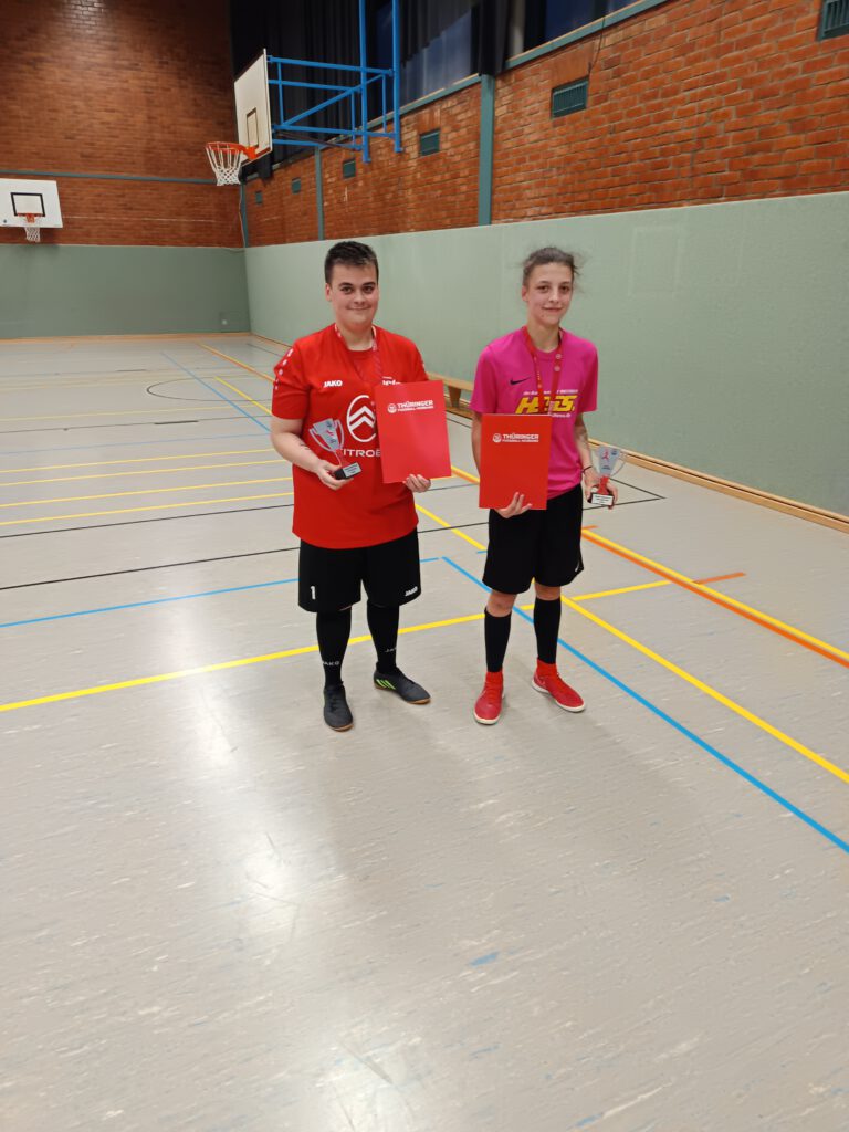 Dieses Spiel war eine einseitige Angelegenheit , denn Silvester Bad Salzungen gewann ungefährdet mit 7:0. Danach wurde das Finale zwischen FC Einheit Bad Berka und Bad Salzungen ausgetragen, das schon ein anderes Kalieber war. Trotz der schnellen 2:0 Führung durch Nicole Gaßmann und Hanna Rudolph, die auch bis vier Minuten vor Schluss anhielt, fing man sich noch zwei Gegentreffer ein. Als sich alles schon auf die Verlängerung einstellte, schloss Babett Heiß 11 Sekunden vor der Sirene einen Konter zum 3:2 Endstand ab. Damit wurde das Team um Coach Jens Voigt Landesmeister 2025/26 der Frauen Futsalliga. Lennox von Windischholzhausen (l.) wurde bester Keeper und Nicole Gaßmann beste Spielerin.