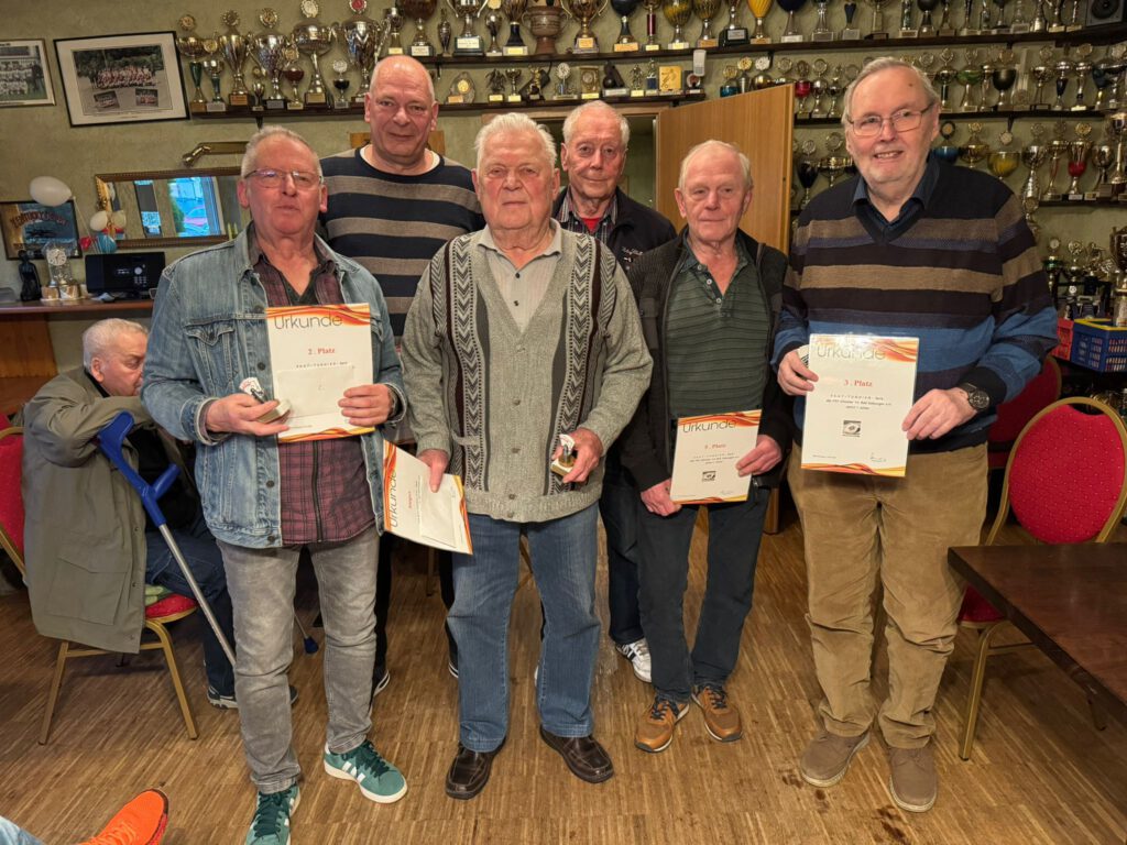 Gesamtsieger der Achterserie nach zwei Streichergebnissen wurde Manfred Friedrich (3.vl.) mit 10624 Punkten. Den Silberplatz erspielte sich Ralph Hildebrandt (l.) mit 9970 Punkten. Über den Bronzerang konnte sich Eckard Röth (r.) für 9836 Punkte freuen. 9654 Punkte reichten Manfred Drechsel (3.v.r.) zu Platz vier. Fünfter wurde Harald Mente (2.v.r.) mit 9304 Spielpunkten . Den sechsten Platz erspielte sich Dirk Siebert (2.v.l.) mit 8859 Punkten. Die Serie 2026/2027 beginnt mit dem ersten Turnier am 20.September 2026 ab 13.30 Uhr im Green Horse.