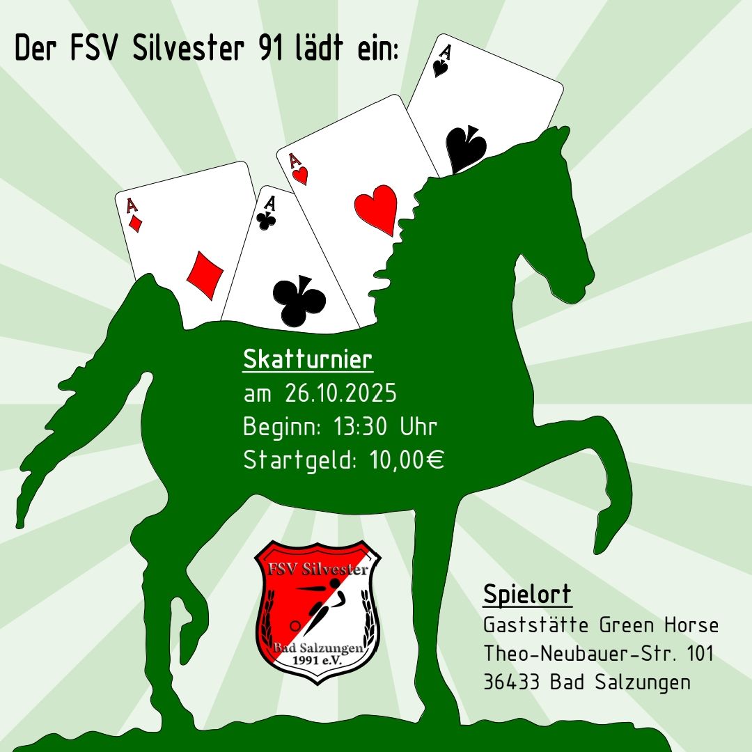 Der FSV Silvester 91 Bad Salzungen läd alle Skatfreunde zum zweiten Skatturnier der Achterserie 2025/26 ein. Gespielt wird am Sonntag 26.10.25 ab 13.30 Uhr in der Gaststätte Green Horse. Das Startgeld beträgt 10.-€. Es gibt Geld und Sachpreise zu gewinnen.